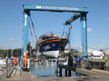 The crew transferred appropriate equipment and stores between the two lifeboats, checked both boats and completed handover paperwork. 12-003 was then walked into the hoist to be lifted and lowered onto the lorry provided by Malcolm Elvy Boat Transport.